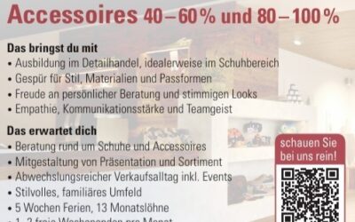 Wir haben eine offene Stelle! Zur Verstärkung unseres Teams suchen wir Verkaufsberater/innen für Schuhe & Accessoires: 40–60 % Teilzeit 80–100 % Vollzeit